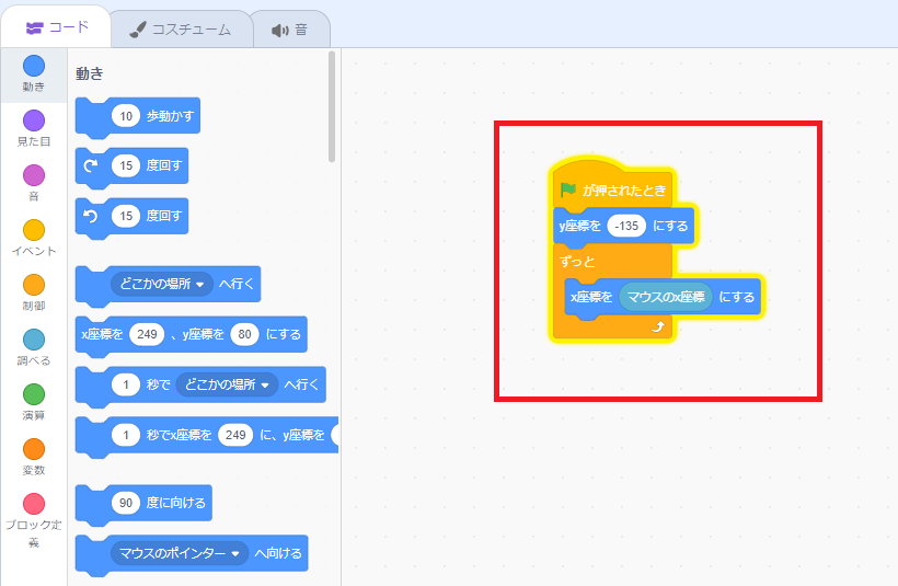 「イベント・動き・見た目・制御・調べる」とたくさんあるけど、図の通りにブロックを組み合わせていきましょう。
