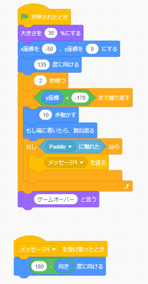 ・「もしPaddleに触れた」ときの動作は、メッセージ1を送ります。